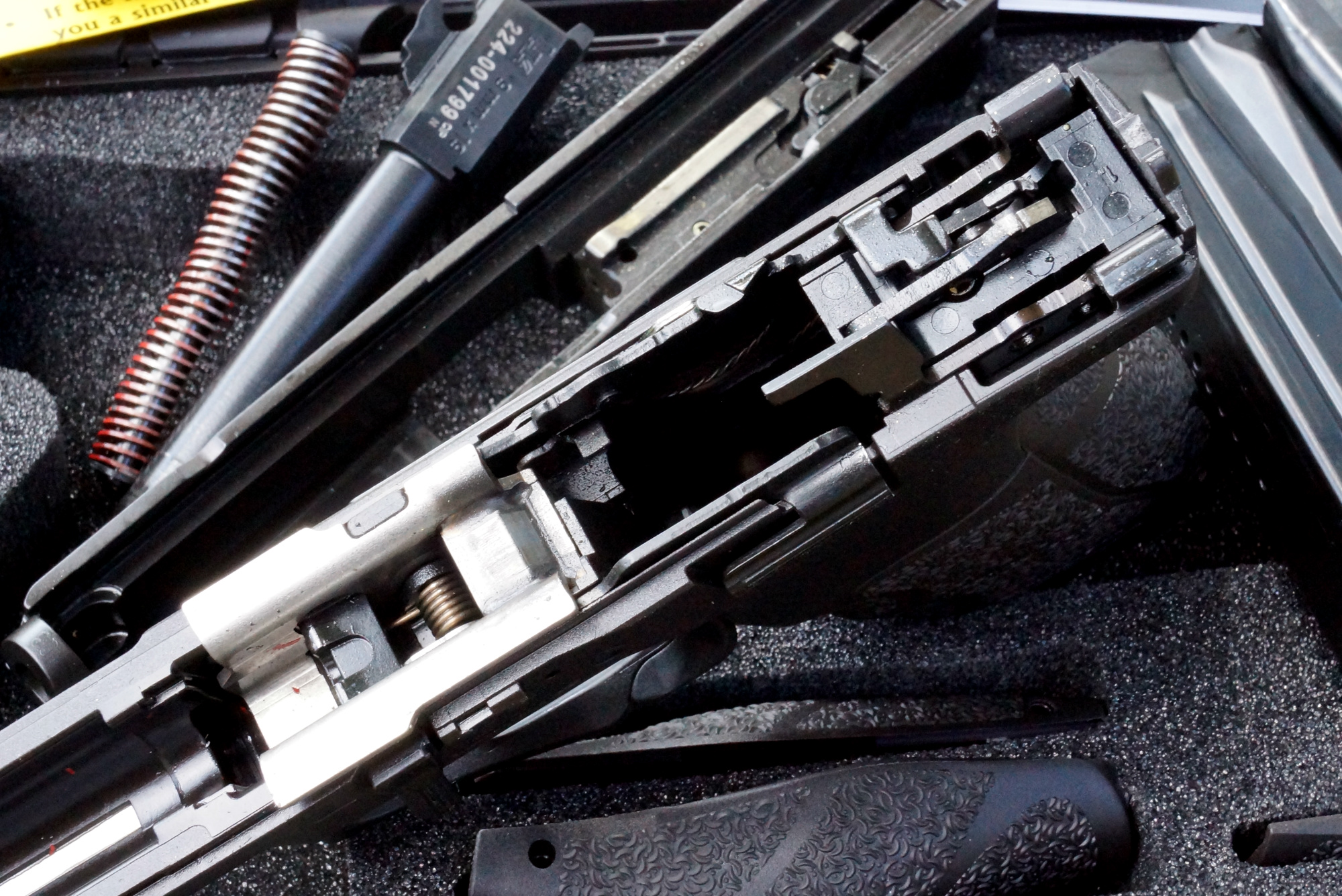 As you'd expect, that barrel drops into the steel slide and locks up Browning short-recoil style with a linkless cam. A flat-wire recoil spring is captured by a steel guide rod. The rotating striker block is pretty interesting -- I think the HK P7 works similarly.