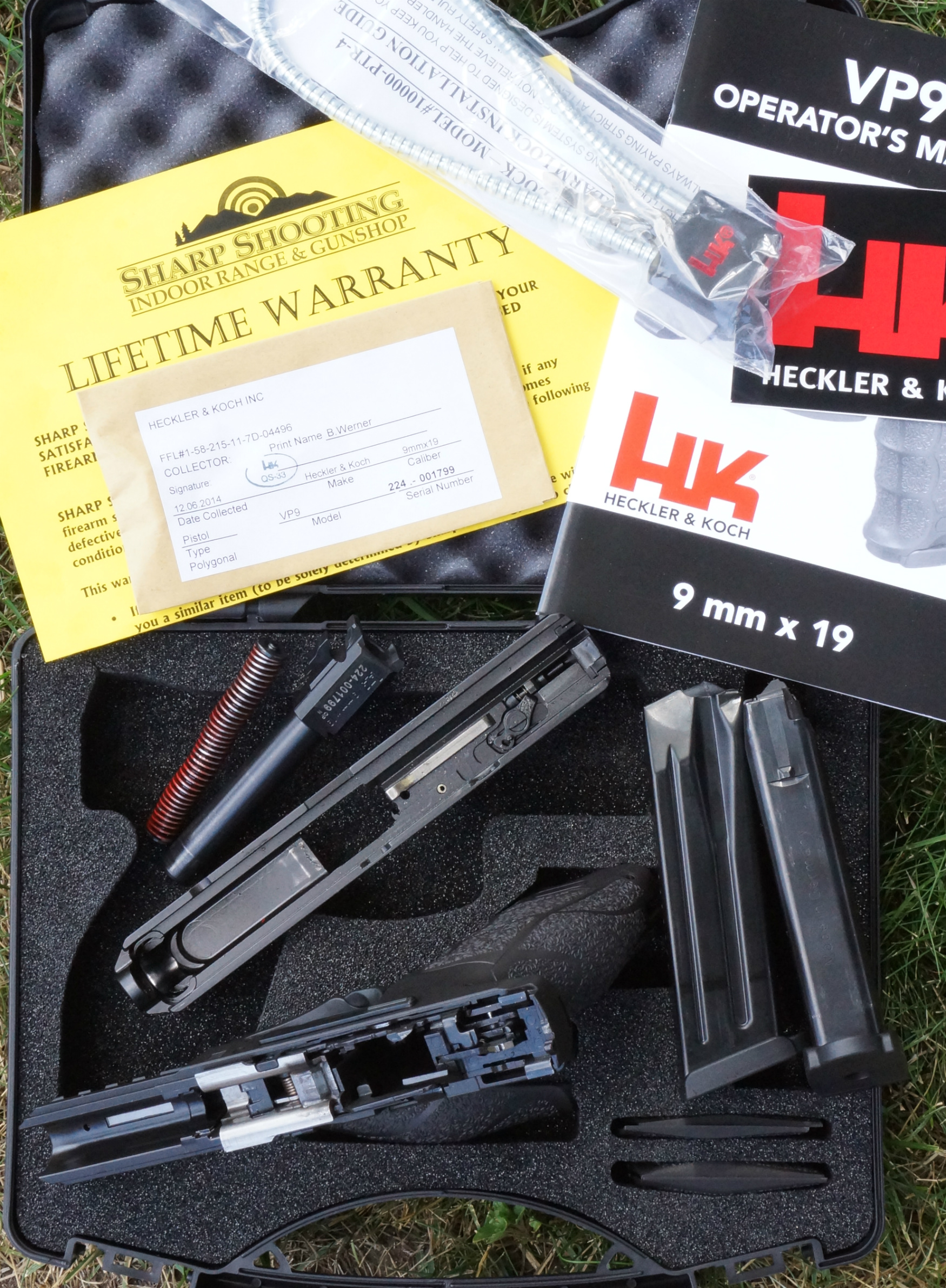 HK's VP9 effectively puts a newly-designed slide on top of a P30 frame. It uses the 15-round magazines from the P30, and it comes with two of those in the black plastic case along with small, medium, and large backstraps and side panels, a magazine loader, owner's manual, fired case, decal, and HK gun lock. Laser cut foam ensures that everything has its place.