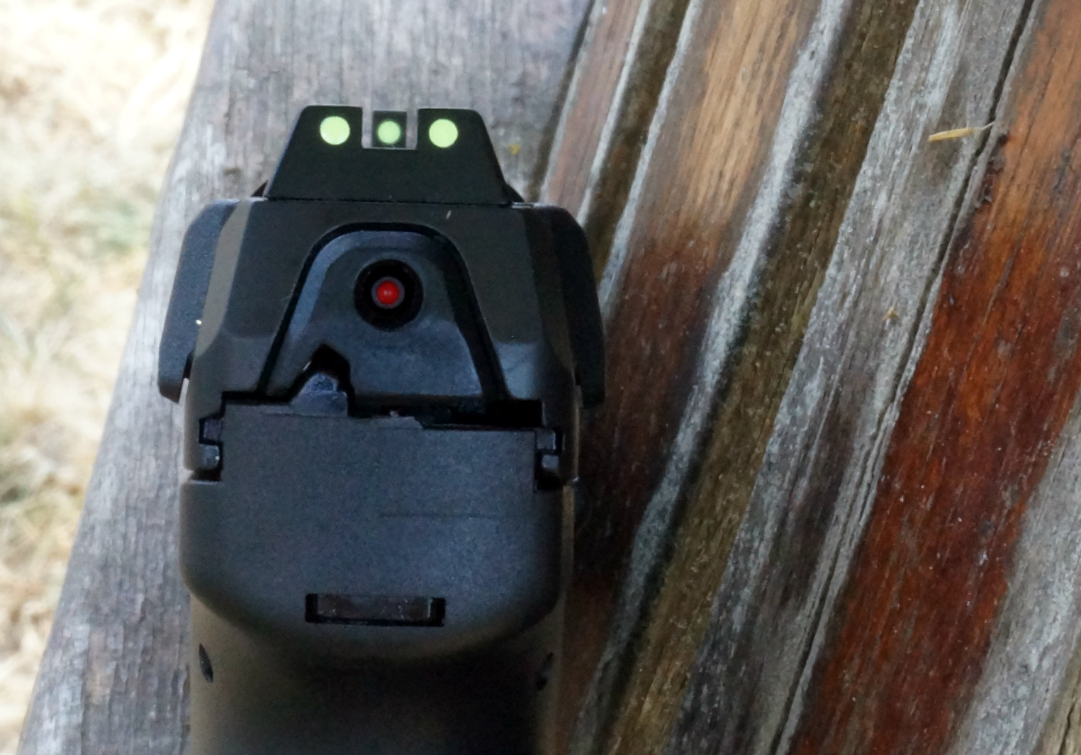 Glow-in-the-dark (must be charged by a light source), 3-dot sights are standard and Tritium sights are optional or sold separately. I found the bright green-ish dots to be crisp, clean and easy to see. The shape and sharp edges of the sights made alignment easy, and the width of the rear notch vs. the width of the front blade struck a pretty good balance between tactical/defensive (lots of light on either side of the front blade for quicker acquisition) and target (less light for ease of more precise alignment).